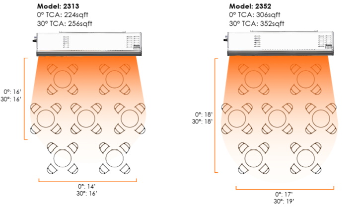 When designing to create ideal comfort levels, Schwank Patio Heaters come in different sizes – each with a different heat map that could suit the requirements of the space. Schwank heaters can be mounted at either 0° or 30°. Refer to the visual below for the Effective vs. Total Coverage Area difference.