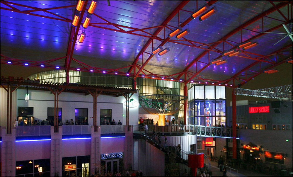 The Power and Light District by the Cordish Group revitalized downtown Kansas City after a decline in the early 80s. Covering 603,000 square feet, the district includes a large theater, chain restaurants, bars, and an outdoor entertainment area called “The Live Block Plaza.” The district’s centerpiece is Kansas City Live!, a one-block area for live music and entertainment, and a covered outdoor plaza for concerts and events.